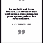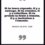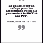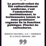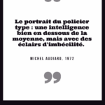 « Police : A toujours tort. » Gustave Flaubert, Dictionnaire des idées reçues, 1913 « Les journaux sont pleins de cauchemars On se tue du matin jusqu’au soir La police est sur les dents Celles des autres évidemment » Boris Vian, chanson « Chantez », 1954 « Comment dans un pays où tout doit marcher par les lois établir une administration dont la nature est de les violer toutes? […]. Récompenser le crime, punir la vertu, c’est toute la police ». François-René de Chateaubriand, De la monarchie constitutionnelle selon la Charte, 1816 « Je crains moins de rencontrer un voleur qu’un homme de la police pendant la nuit. Le premier me prendra ma bourse, mais l’autre me prendra ma liberté. » Louis Veuillot, cité à la Chambre des députés, 18 janvier 1884 « La fonction de police est presque tout entière dans la contrainte imposée à la liberté des uns au profit de la liberté des autres. » Célestin Hennion, directeur de la sûreté générale, discours, 22 novembre 1907 « On commence par vouloir la justice et on finit par organiser une police. » Albert Camus, Les Justes, 1949 « La morale commence là où s’arrête la police. » Alain (Emile Chartier), Propos sur la religion, 1938 « A mesure que les peuples montent en civilisation, les gouvernements descendent en police. » Jules Barbey d’Aurevilly, cité par Charles Buet, Impressions et souvenirs, 1891 « Le personnage du « flic » sous toutes ses formes – inspecteurs, commissaires, « privés », voire gendarmes, bien qu’ils fassent partie de l’armée, hante les écrans des salles obscures. Tantôt justiciers, tantôt ripoux, ils ont pris dans notre imaginaire collectif la place que, tragique ou comique, le théâtre réservait jadis à ses héros. » Arlette Lebigre, La police – une histoire sous influence, 1993 « Et la police veillait. La police représente la première institution du despotisme. » Eugène Pelletan, Décadence de la monarchie, 1861 « Je croirai n’ajouter rien de superflu, messieurs, en vous faisant remarquer que […] la police, par sa nature, est antipathique à toute liberté » François-René de Chateaubriand, Opinions et discours politiques, 1828 « Le fonctionnaire de la police nationale est loyal envers les Institutions Républicaines. Il est intègre et impartial ; il ne se départit de sa dignité en aucune circonstance. […]. Il a le respect absolu des personnes, quelles que soient leur nationalité ou leur origine, leur condition sociale ou leurs convictions politiques, religieuses ou philosophiques. » Code de déontologie de la police nationale, 1986, art. 7 « La meilleure raison qu’a le peuple de ne pas aimer la police est l’emploi abusif de certaines manœuvres de force connues sous le nom de passage à tabac. » Edmond Locard, La police, ce qu’elle est, ce qu’elle devrait être, 1919 « L’idée que la mission essentielle de la police est « d’appréhender les délinquants » est une idée relativement récente et c’est une idée courte, qui traduit mal la pratique policière effective, et ne répond que très partiellement à la demande sociale adressée au service public policier. » Dominique Monjardet, article « Comment apprécier une politique policière?, 2006 « Il n’y a pas en France, de ministère aussi arriéré que le ministère de l’intérieur ; c’est un ministère de l’ancien régime. On y fait la police et surtout la police électorale. » Edouard Herriot, député maire de Lyon, Congrès de l’Habitation, 9-12 octobre 1919 « Lorsque la police avoue son impuissance, je me sens tout ragaillardi : il y a de l’espoir. » Romain Gary, La danse de Gengis Cohn, 1967 « Les institutions, les polices humaines, pour le bien général, nous accablent de chaînes. » Sieur de Desmahis, cité dans article « Police », Larousse, Grand dictionnaire universel du XIXème siècle « Le portrait-robot du flic culturellement conforme, c’est l’emmerdeur institutionnel, le tortionnaire latent, le sous-prolétaire cogneur de la fonction publique. Pluriel de caricatures. » Bénédicte Desforges, Flic – Chroniques de la police ordinaire, 2007 « La police est faite par le pouvoir, par ce que celui-ci exprime et condense des rapports entre l’Etat et la société civile et des rapports entre les classes sociales » Dominique Monjardet (sous le nom de Pierre Demonque), Les policiers, 1983 « La police, c’est un refuge pour les alcooliques qu’on n’a pas voulu à la SNCF et aux PTT. » Coluche, sketch « Le flic », 1975 « Sans la police, tout le monde tuerait tout le monde. Et il n’y aurait plus de guerre… » Henri Jeanson, dialogues du film La fête à Henriette de Julien Duvivier, 1952 « Qu’on extermine surtout cette robe grise, cette police, l’inquisition de la France, le vil instrument de notre servitude, ces milliers de délateurs, ces inspecteurs, la lie du crime et le rebut des fripons mêmes! » Camille Desmoulins, « La France libre », 17 juillet 1789 « Après tout, les voleurs et les assassins ne sont pas un danger pour l’ensemble de la société. Ils en sont le produit et la justification de son Code, de sa police et de sa magistrature. » Jean Grave, Le mouvement libertaire sous la 3e République, 1930 « La question n’est pas de savoir pourquoi il y a des gens qui jettent des pierres sur la police, mais de savoir pourquoi il y en a si peu. » Wilhelm Reich, apocryphe « Obéissez à vos porcs qui existent. Je me soumets à mes dieux qui n’existent pas. Nous restons gens d’inclémence. » René Char, 1962 « Offrir des fleurs aux flics ? La seule manière et nous en convenions gaiement, c’est dans un pot, depuis une fenêtre. » William S. Burroughs, 1969 « Si je préfère les chats aux chiens, c’est parce qu’il n’y a pas de chat policier. » Jean Cocteau « CRS SS ! » Mineurs grévistes du nord de la France, 1947 « Le portrait du policier type : une intelligence bien en dessous de 