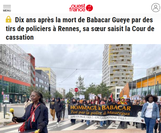 Et en mai 2023, le juge rend une ordonnance de non-lieu. Corroborant la thèse de la légitime défense du policier. Une ordonnance de non-lieu confirmée par la chambre de l’instruction de la cour d’appel de Rennes, le 6 juin. Mais Awa Gueye ne compte pas s’arrêter là : Je veux des réponses claires, une enquête correcte, sans mensonge. Le combat continuera tant que je suis vivante. Elle s’est donc pourvue en cassation. La date de l’audience n’est pas encore connue.
