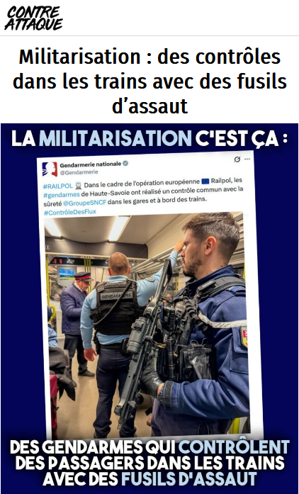 On y voit un gendarme avec un fusil d’assaut HK G36 au premier plan, et un contrôleur de la SNCF qui vérifie avec bonhommie le ticket d’un passager à l’arrière. Voilà la nouvelle normalité dans ce pays. Vérifier des titres de transport en présence d’armes de guerre.