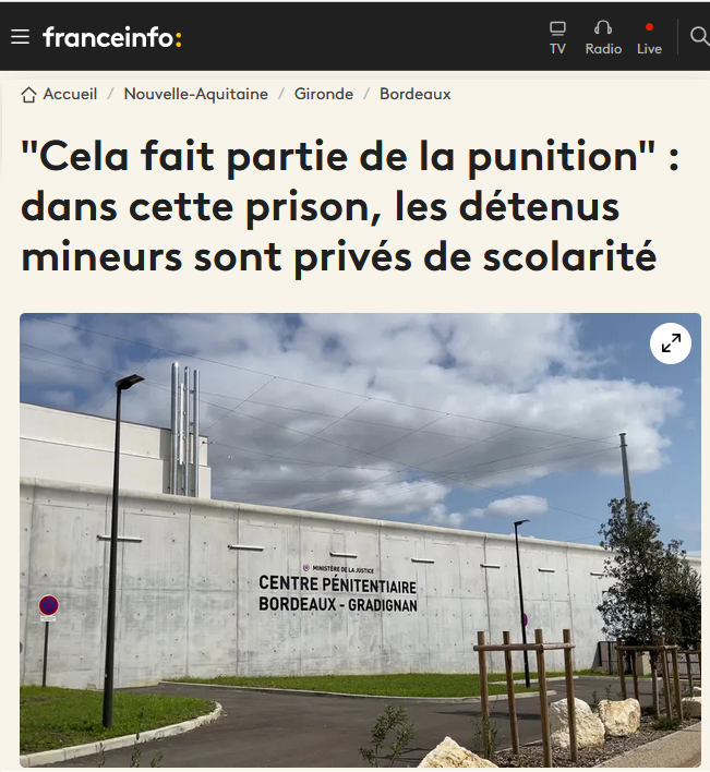 Selon l’Observatoire International des Prisons (OIP) et le député Pouria Amirshahi, le centre pénitentiaire de Bordeaux-Gradignan priverait volontairement d’éducation certains mineurs afin de les punir de leur mauvaise conduite.