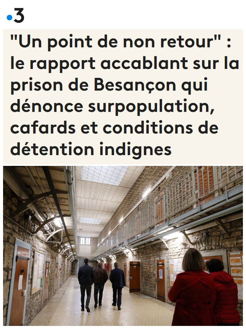 Fin mars 2026, le Contrôleur général des lieux de privation de liberté (CGLPL) a publié un rapport sur l’état de la prison de Besançon dans le Doubs. Le constat est sans appel. Les conditions de détention y sont indignes en raison de la vétusté des lieux et d’une surpopulation carcérale.