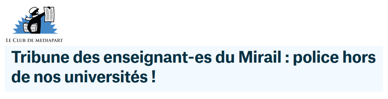 Nous, enseignant·es, chercheur·es, de cette université, dénonçons cette répression inacceptable. Nous adressons notre solidarité aux étudiant·es réprimé·es. En même temps que la police empêchait les étudiant·es de se réunir à l’université du Mirail, de violentes interventions policières ont également réprimé des mobilisations à la Sorbonne et à Sciences Po Paris. Nous dénonçons cette généralisation des interventions policières dans les universités qui nie le principe, très ancien, des franchises universitaires.