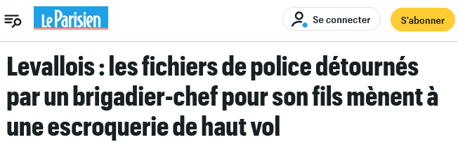 Les soupçons de détournements de fichiers portés sur un brigadier-chef du commissariat de Levallois ont mené les enquêteurs à des arnaques et ramifications d’ampleur. Au cœur du dossier, le fils de ce policier est poursuivi pour avoir livré à des connaissances des informations confidentielles captées par son père, mis au point des escroqueries, notamment au crédit bancaire, et participé à la création d’une société d’arnaque aux encarts publicitaires où l’on retrouve le gratin de ce type d’affaires.