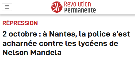 Une démonstration de soutien violemment réprimée au lycée des Pontonniers où les élèves mobilisés ont été très violemment délogés par les forces de police qui n’ont pas hésité à leur asséner des coups de bouclier, à les plaquer brutalement au sol ou à leur projeter du gaz lacrymogène à bout portant. Une brutalité telle qu’un lycée a été transféré aux urgences par les pompiers après avoir été aspergé de gaz lacrymogène au visage.