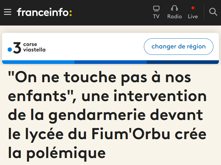 (…) « Après les portes défoncées et les appartements saccagés, la mort d’un homme interpellé par un gendarme qui avait gardé le doigt sur la détente, voilà que les pandores jouent les cowboys avec des collégiens du Fium’orbu », dénonce le parti indépendantiste. En ajoutant : « Que ces serviteurs zélés du désordre public n’oublient jamais qu’ils ne sont pas chez eux et que les enfants en Corse ont des parents… »