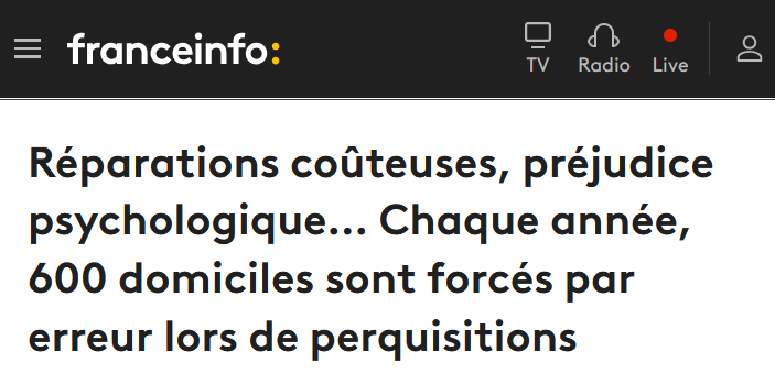 (…) Le phénomène est si fréquent que le ministère de la Justice a mis en place une plateforme en ligne spécialement dédiée au remboursement des portes enfoncées par erreur. L’an dernier, 589 personnes, presque deux par jour, ont été dédommagées. Coût total : plus de 1,3 million d’euros.