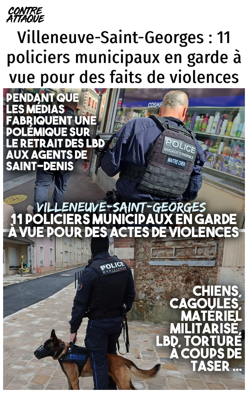 Une photo du quotidien Le Parisien montre d’ailleurs des policiers de Villeneuve-Saint-Georges avec un LBD en main, des gilets pare-balles, la mention «Brigade cynophile» – comme si des agents municipaux avaient besoin de chiens d’attaque – et des cranes rasés à blanc avec un tatouage douteux. Une autre capture un agent cagoulé avec un chien en laisse. Le compte Instagram de la ville de Villeneuve-Saint-Georges, très actif, publie chaque semaine des vidéos et photos d’arrestations, de fouilles et de descentes avec des chiens de la police municipale. Ambiance.